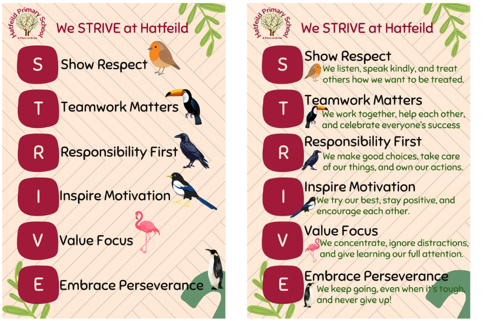 The STRIVE expectations must be clearly displayed in every classroom using the official posters provided. Each week of the term will highlight a specific STRIVE focus, and pupils who demonstrate excellence in that area will be recognised during celebration assembly with a certificate.